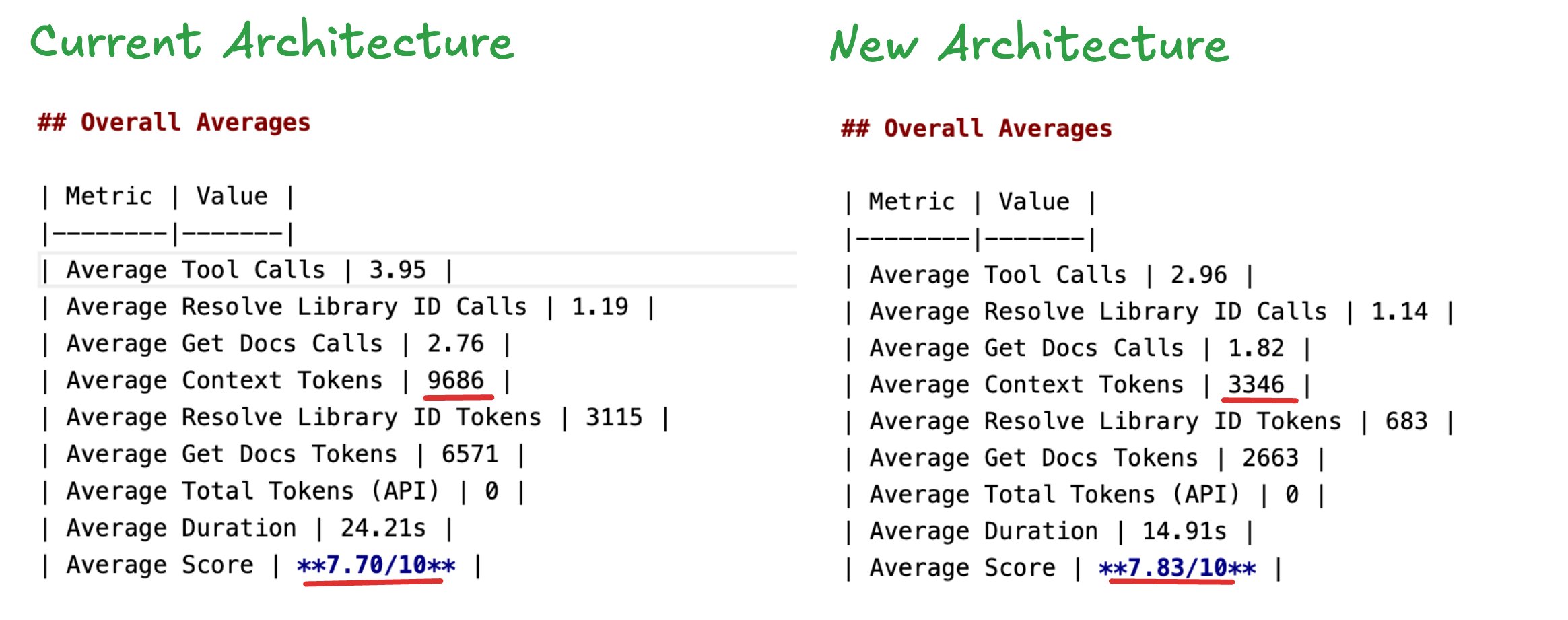 Context7 gives LLMs access to up-to-date documentation, so they stop hallucinating outdated APIs. We just updated its architecture to dramatically reduce context bloat. Here's what changed: