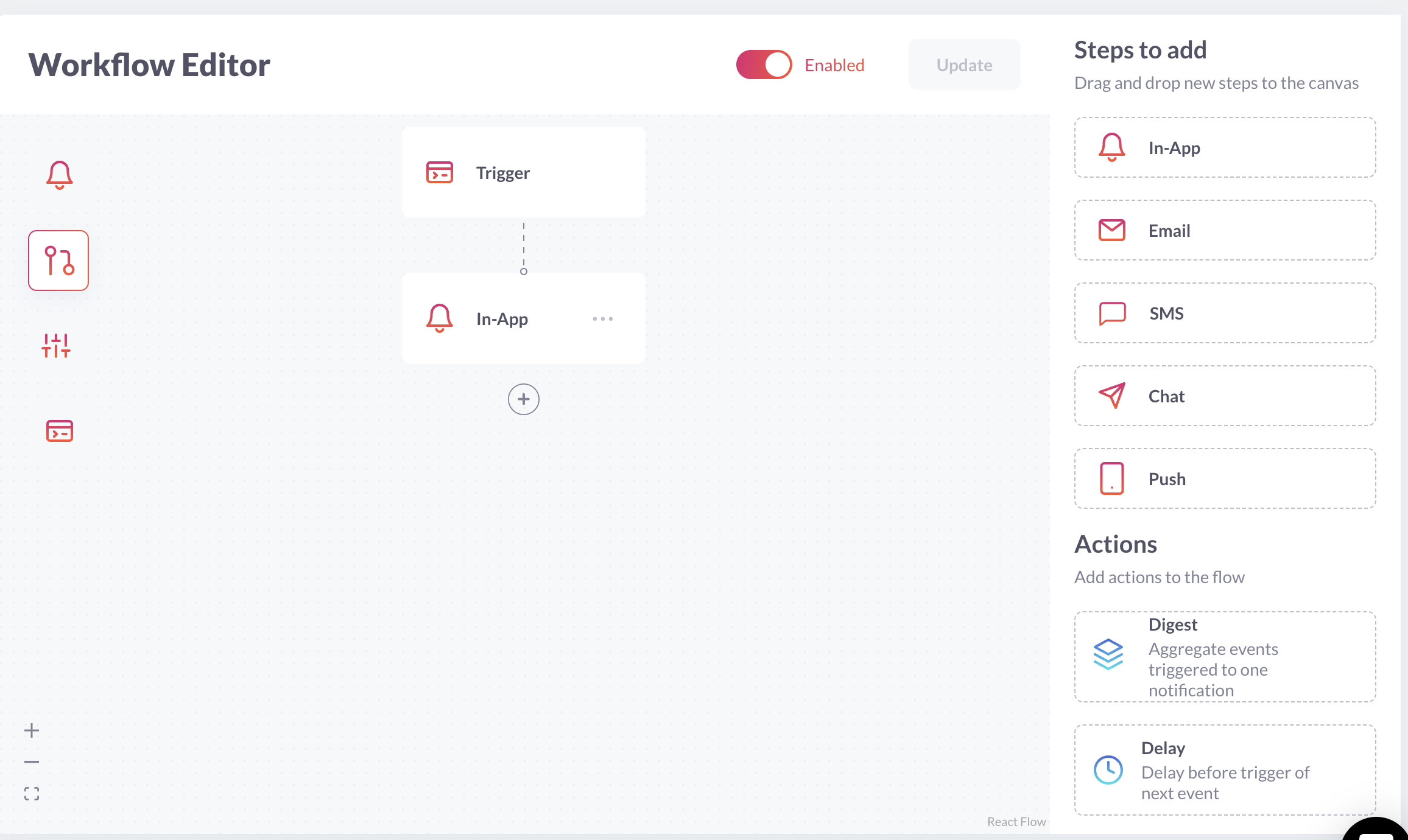 add.failureand also add theIn-Appstep. - Go to web.novu.co/settings and copy your api key and application identifier, you'll need those later.